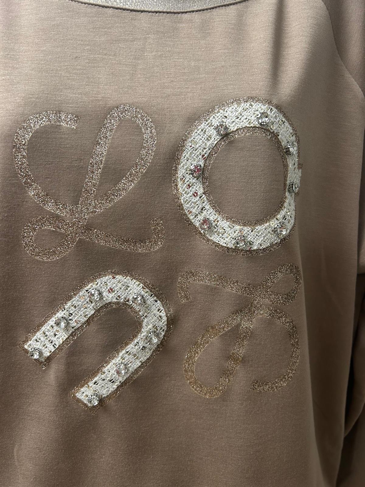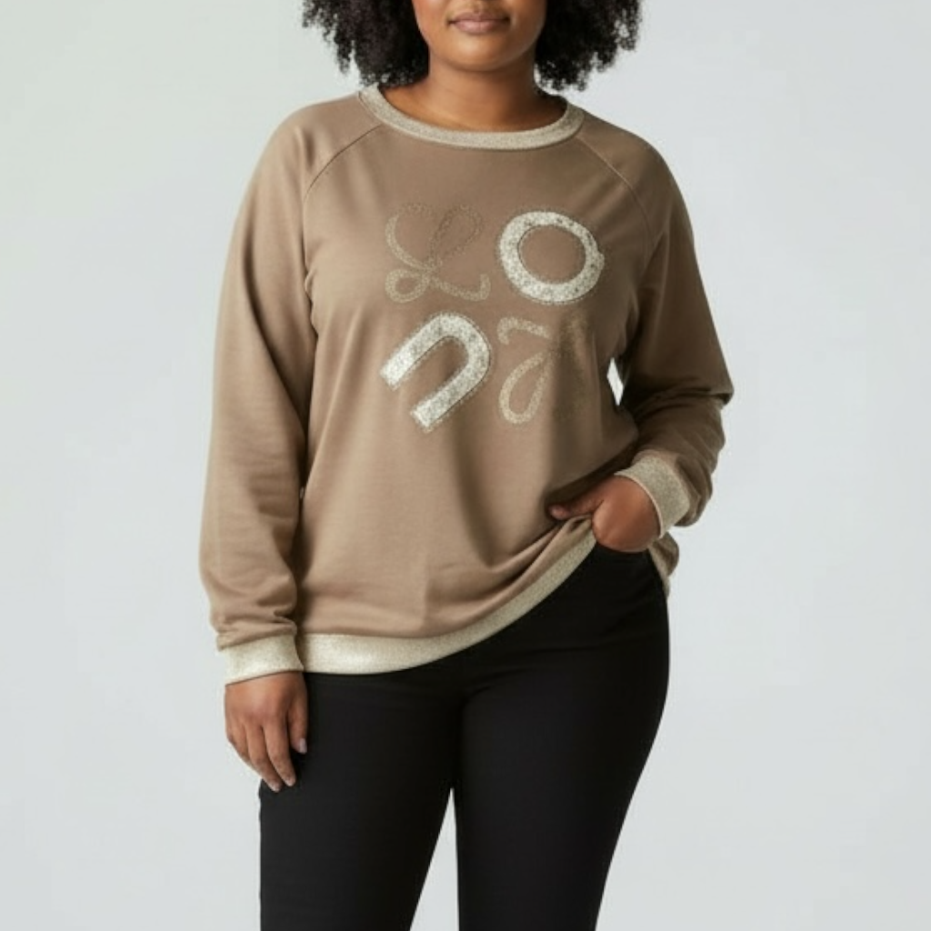A soft mocha jumper featuring elegant cream embellishment detailing and subtle shimmer trims. Relaxed, flattering and effortlessly stylish.
