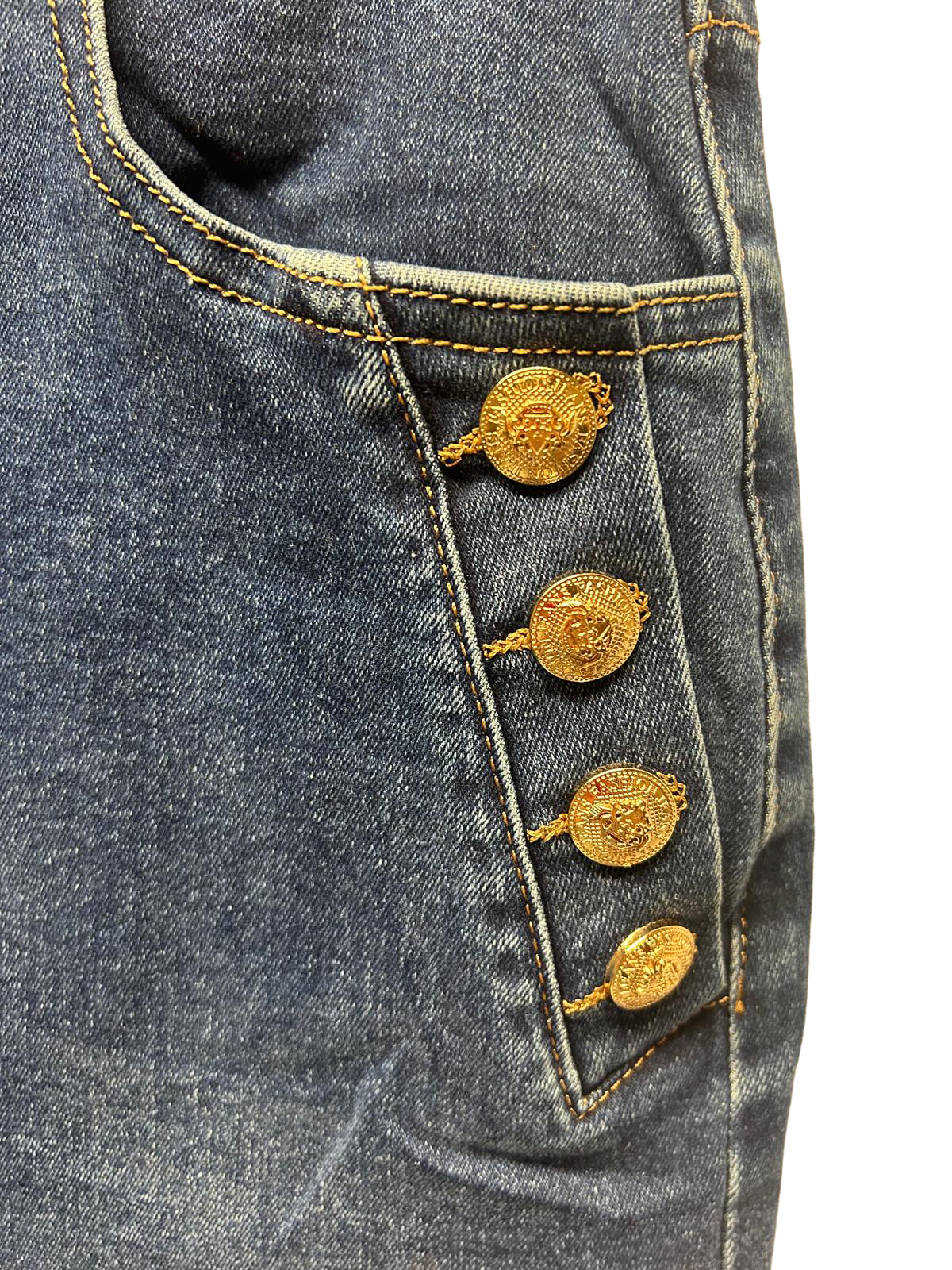 Classic denim skirt with gold button detailing and a back slit for a stylish finish.