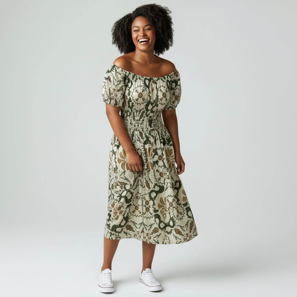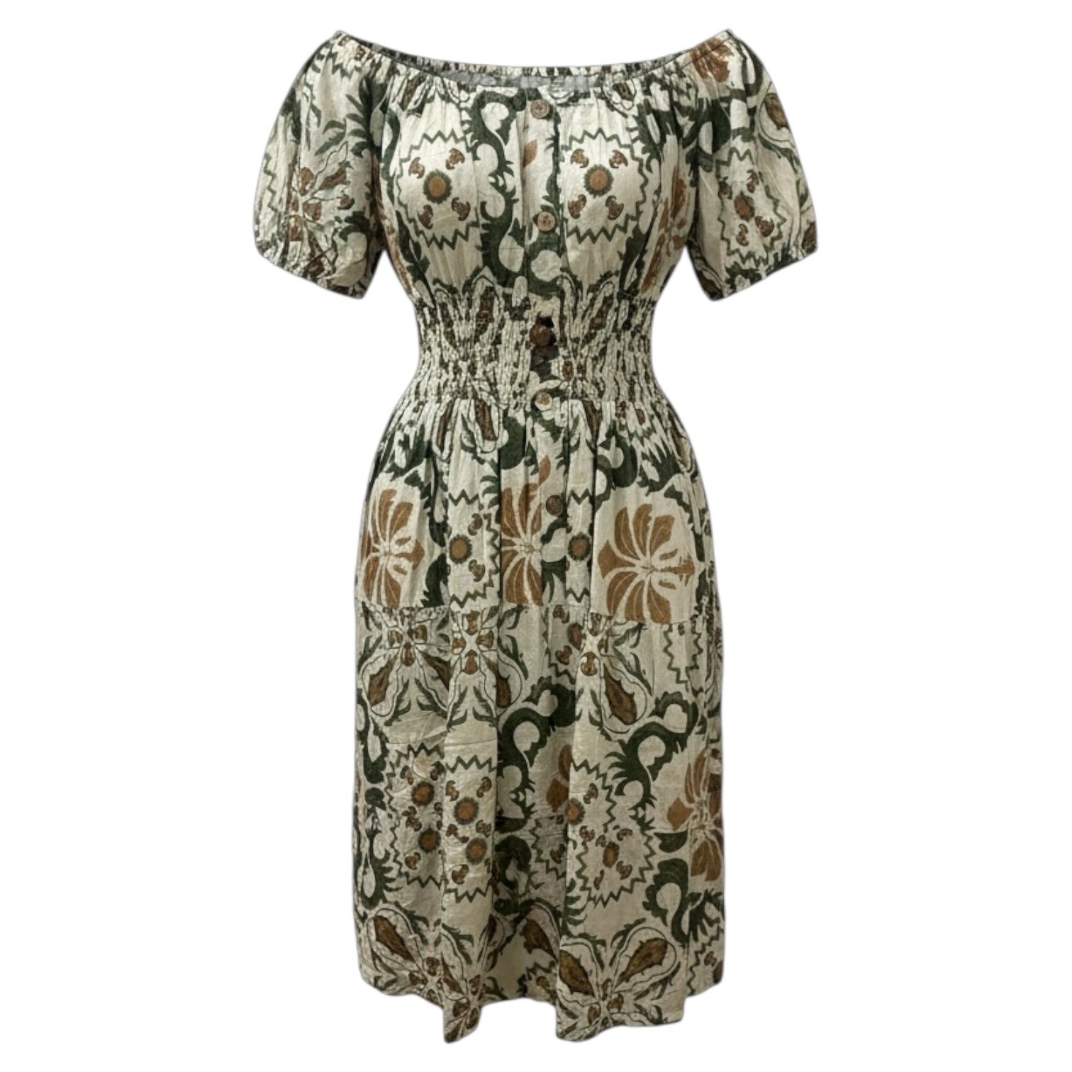 A relaxed bardot-style midi dress featuring an earthy green and neutral boho print, elasticated neckline and flattering shirred waist. Finished with short sleeves and button-front detailing for effortless everyday style.