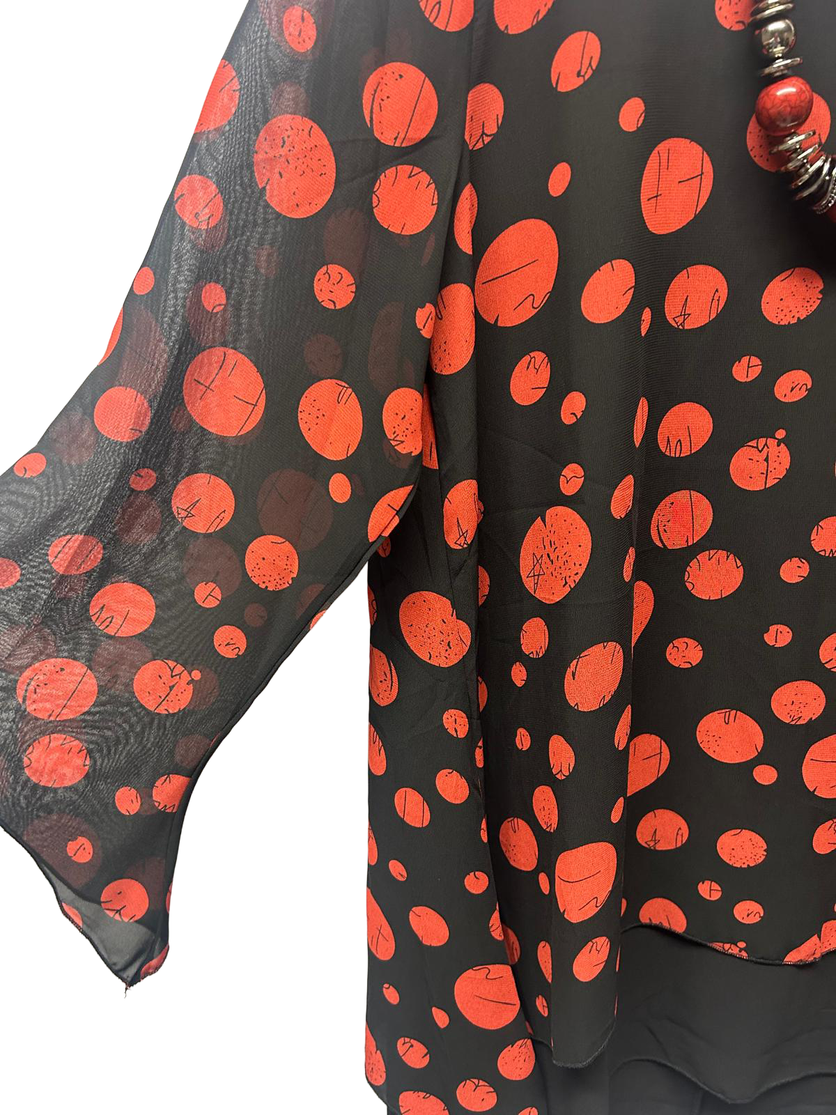 Turn heads in this stylish black blouse, beautifully detailed with bold red spots. Designed with elegant waterfall sides for a flattering drape, this blouse brings both comfort and sophistication to your wardrobe. Finished with a coordinating necklace (included), it’s the perfect ready-to-wear outfit upgrade for day or evening looks.