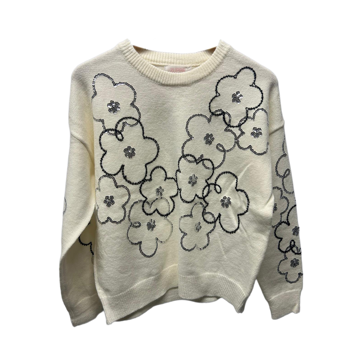 A cosy knit jumper decorated with sparkling sequinned flowers — feminine, chic and perfect for adding a touch of glamour.