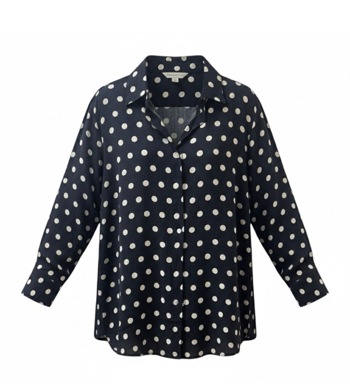 Available in two versatile colourways — soft cream with brown spots for a warm, neutral look, or navy with white spots for a timeless contrast — this blouse offers effortless styling options for every season.