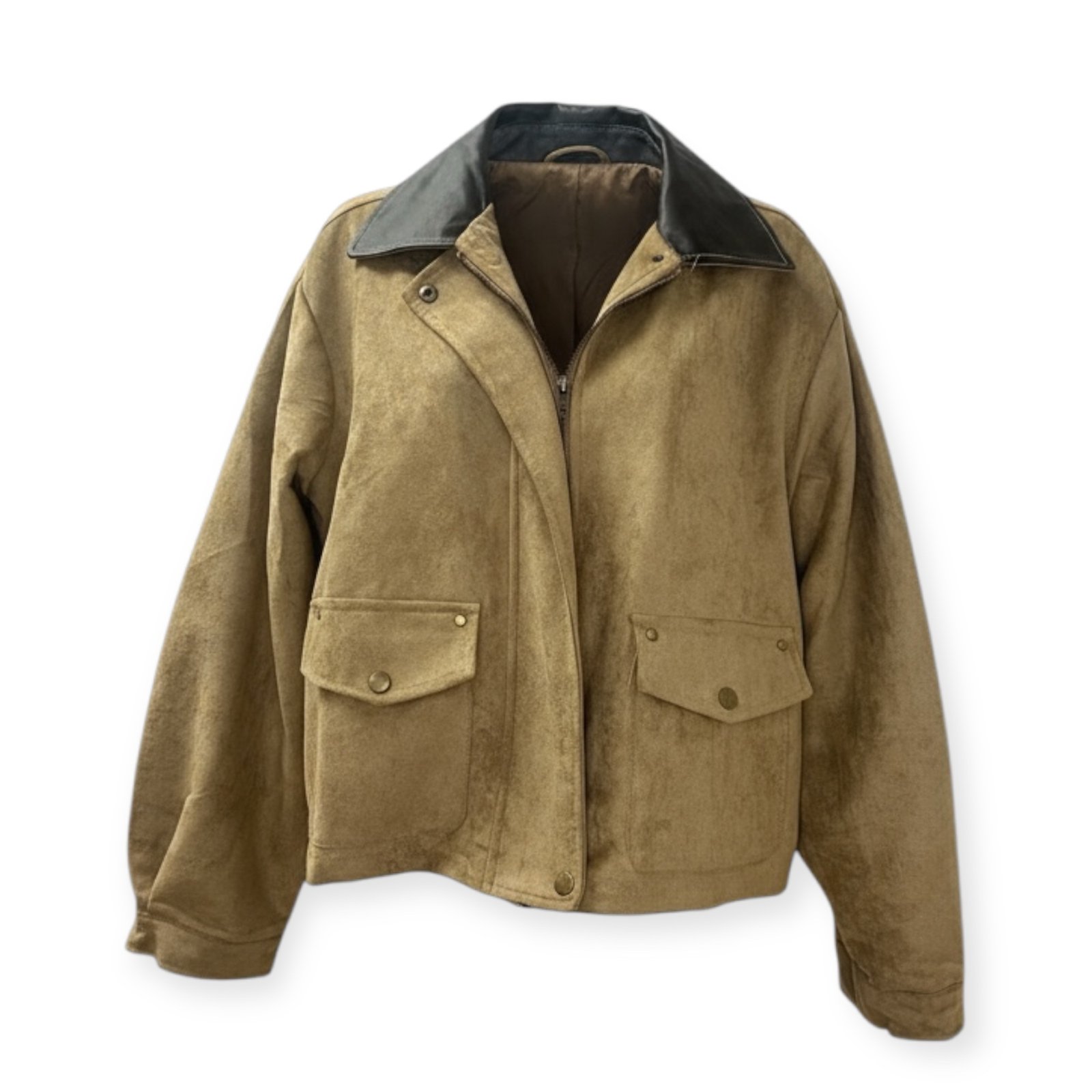 Soft suede-effect jacket with contrast brown PU collar and stud detail.