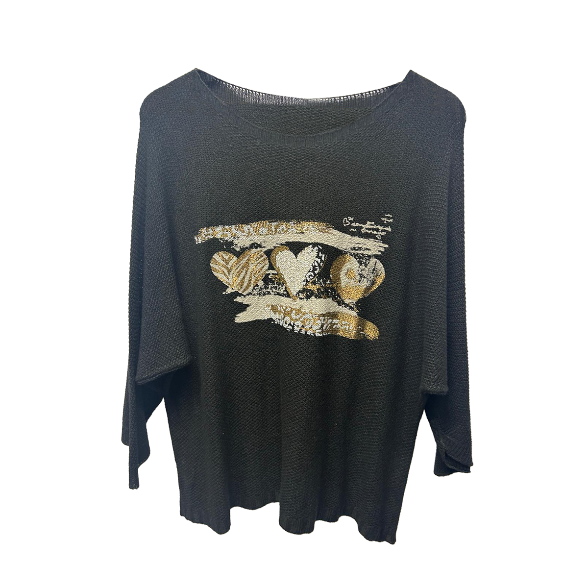 Stay cute and comfortable with this lightweight jumper, finished with a trio of hearts in contrasting patterns. Perfect for layering or wearing on its own, this soft knit adds a touch of fun to your everyday style. Pair it with jeans for a relaxed look or tuck it into a skirt for something a little more chic. Available in grey or brown.