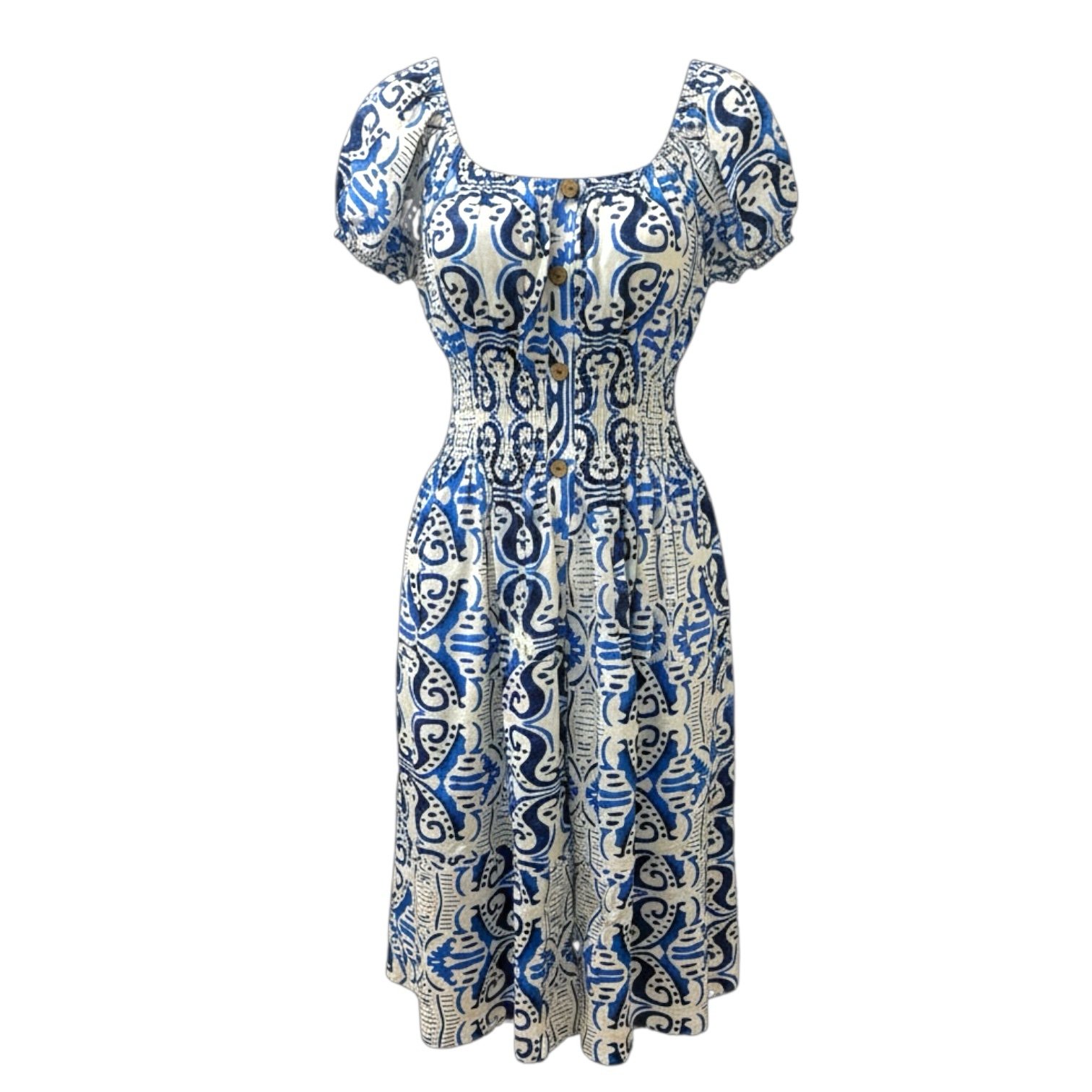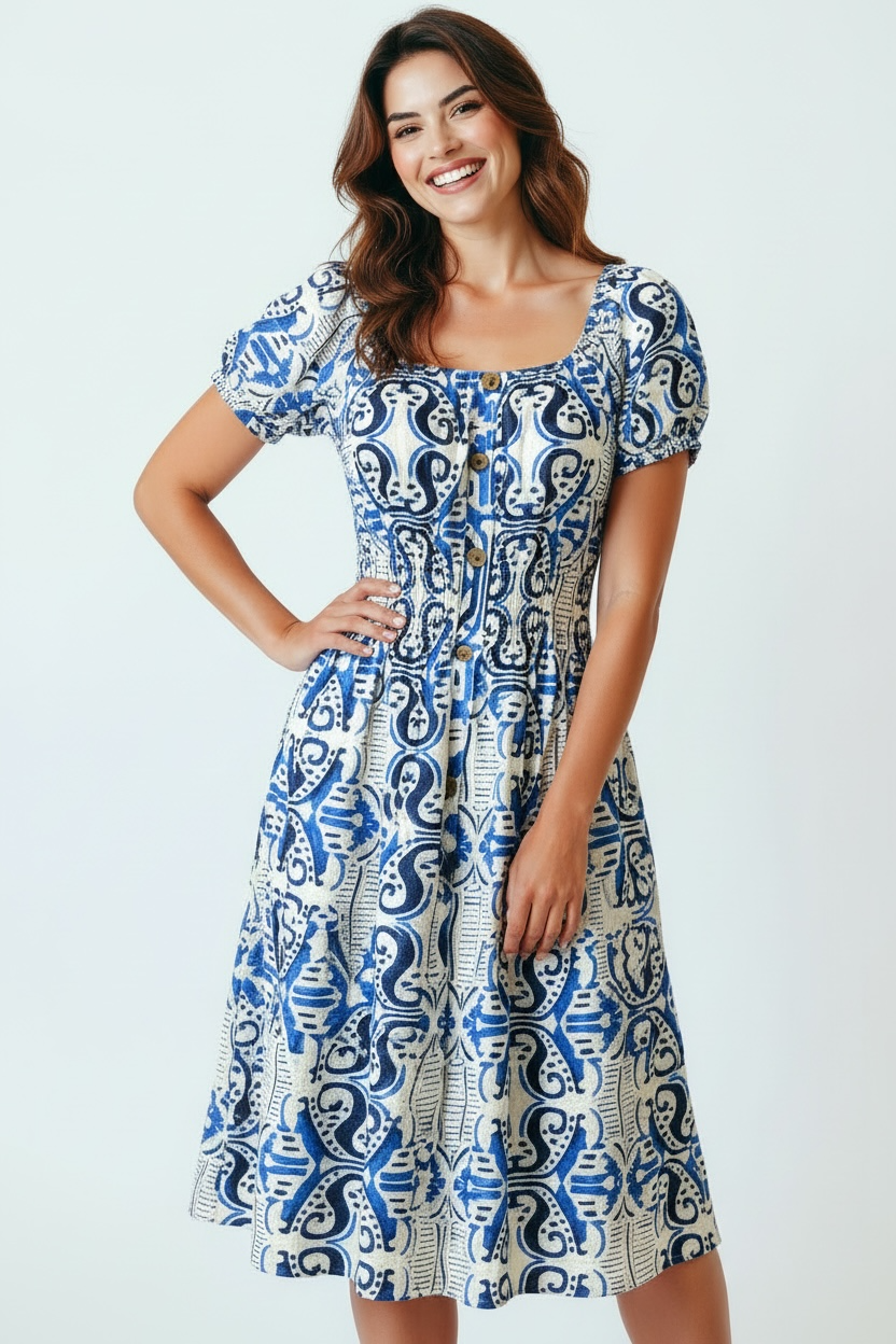 Refresh your wardrobe with this effortlessly stylish white and navy blue print midi dress, designed to offer a flattering fit with classic appeal. Crafted from a lightweight, breathable fabric, it combines comfort with an elegant silhouette that’s easy to wear from day to evening.