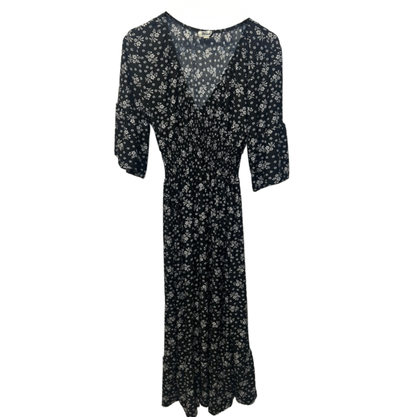 A flowy black boho dress with gold floral print, featuring a lace-up neckline, long sleeves with flared cuffs, and a detailed border hem for a chic, standout look.